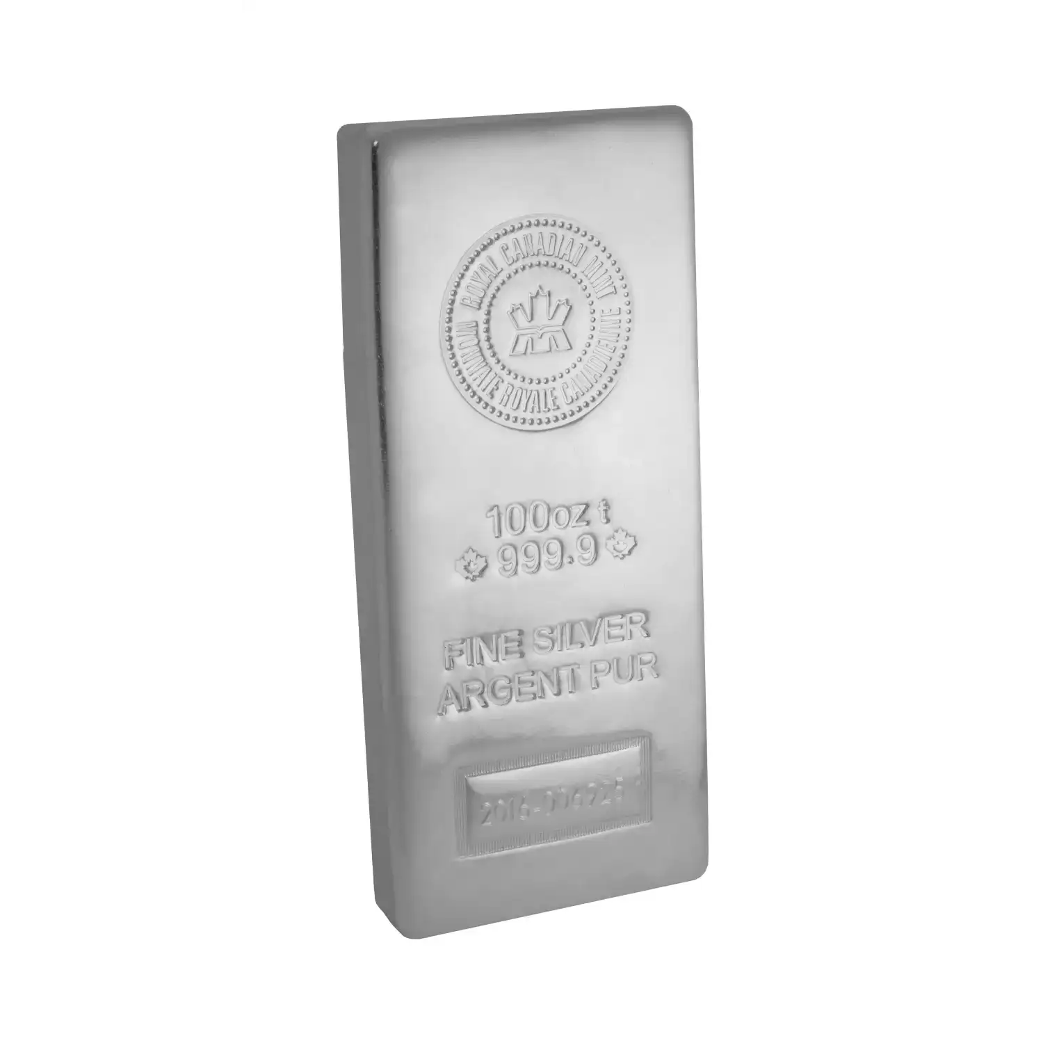 Struck by Royal Canadian Mint, each 100 ounce RCM Silver Bar weighs 100 troy ounces and is composed of .9999 fine silver.